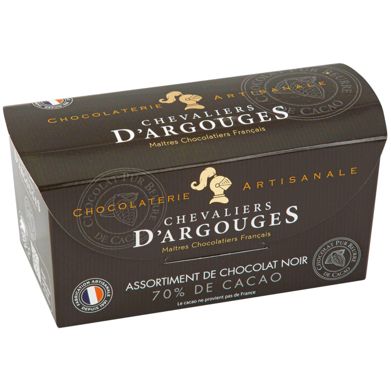 Des chocolats noirs 70% pur beurre de cacao réunis dans un ballotin élégant 185g.