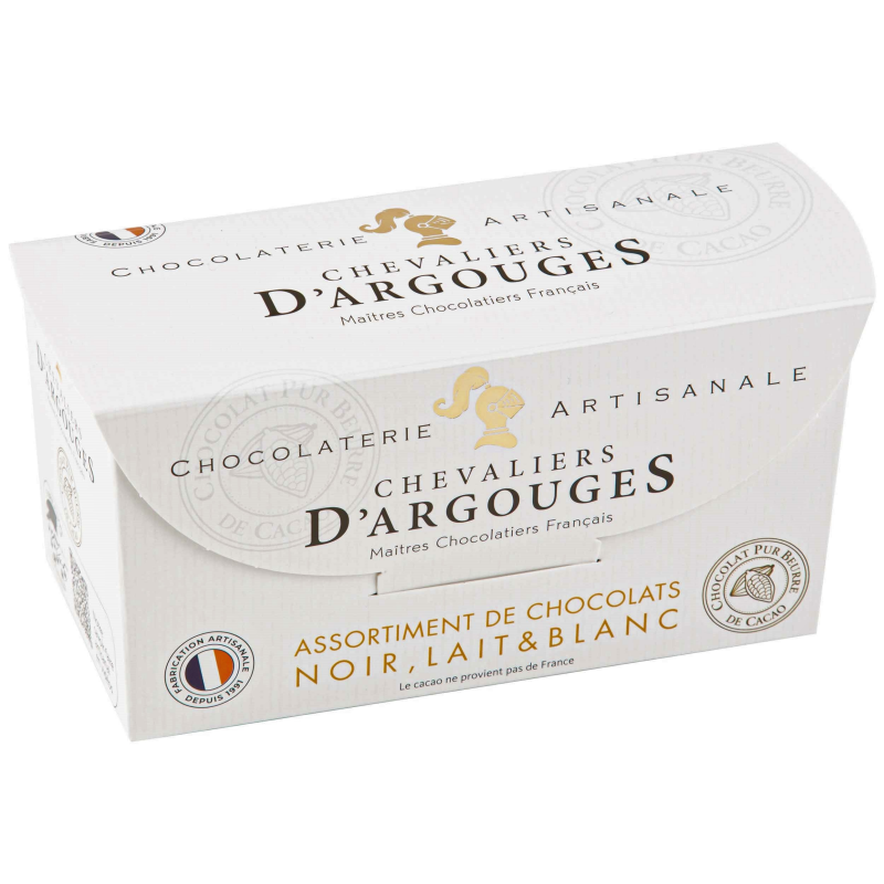 Chocolat noir 70% de cacao, chocolat au lait 33% de cacao et blanc.