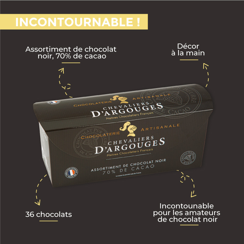 Des chocolats noirs 70% pur beurre de cacao réunis dans un ballotin élégant 365g.