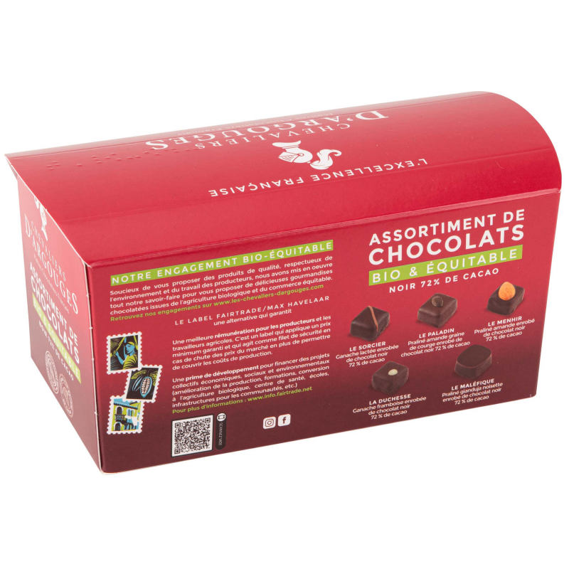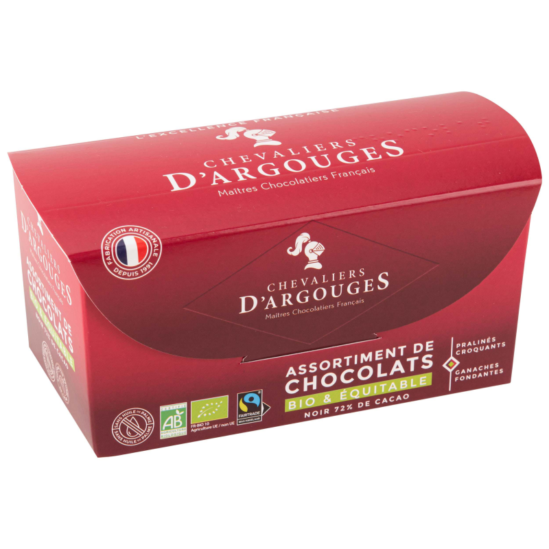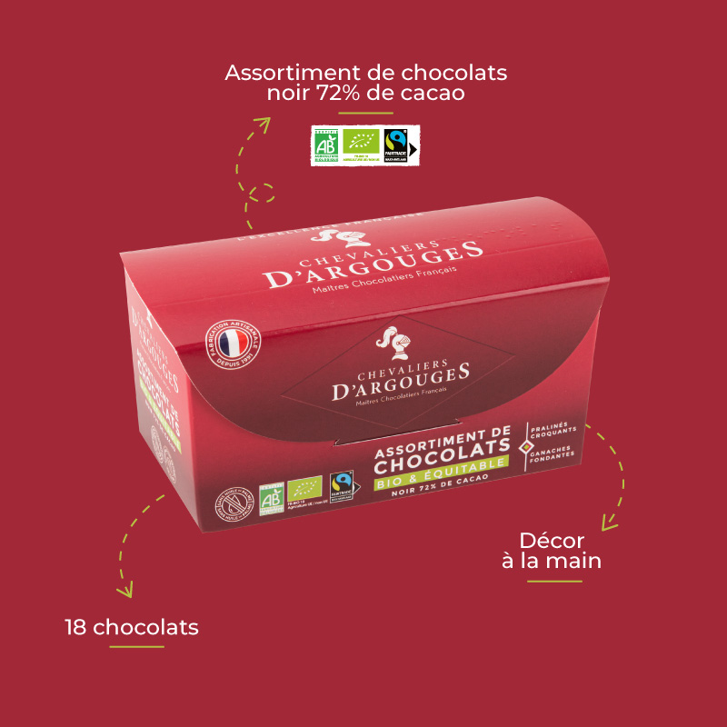 Le chocolat noir à 72 % de cacao de ce ballotin est issu de l’agriculture biologique et du commerce équitable. Les Chevaliers d’Argouges s’engagent à vos côtés avec cet assortiment engagé. Et c’est irrésistible !