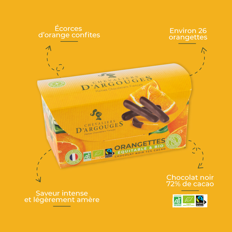 Imaginez le croquant du chocolat noir qui protège le moelleux d’une orangette confie biologique et issue du commerce équitable.