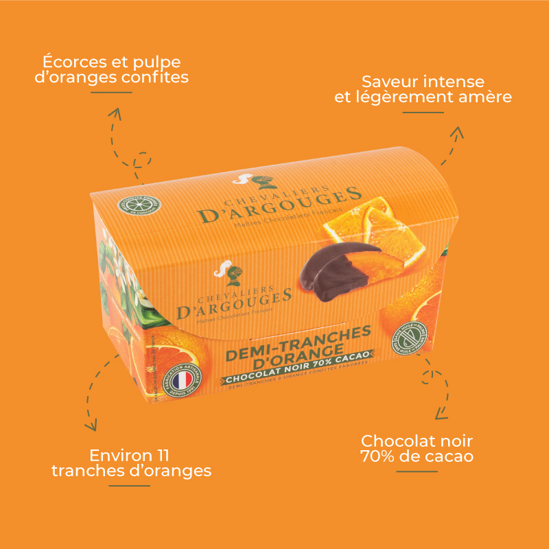 Savourez la magie de Noël avec nos tranches d'oranges confites enrobées de chocolat noir 70%.