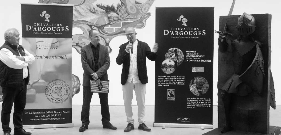 « Création d’une sculpture en chocolat de 2 mètres (400 kilos) à l’occasion des 30 ans de la chocolaterie. Réalisée par l’artiste Xavier Gonzales (directeur de l’Usine Utopik) cette sculpture représente un chevalier traversant un mur symbolisant la porte du temps écoulé depuis la fondation de l’entreprise. »