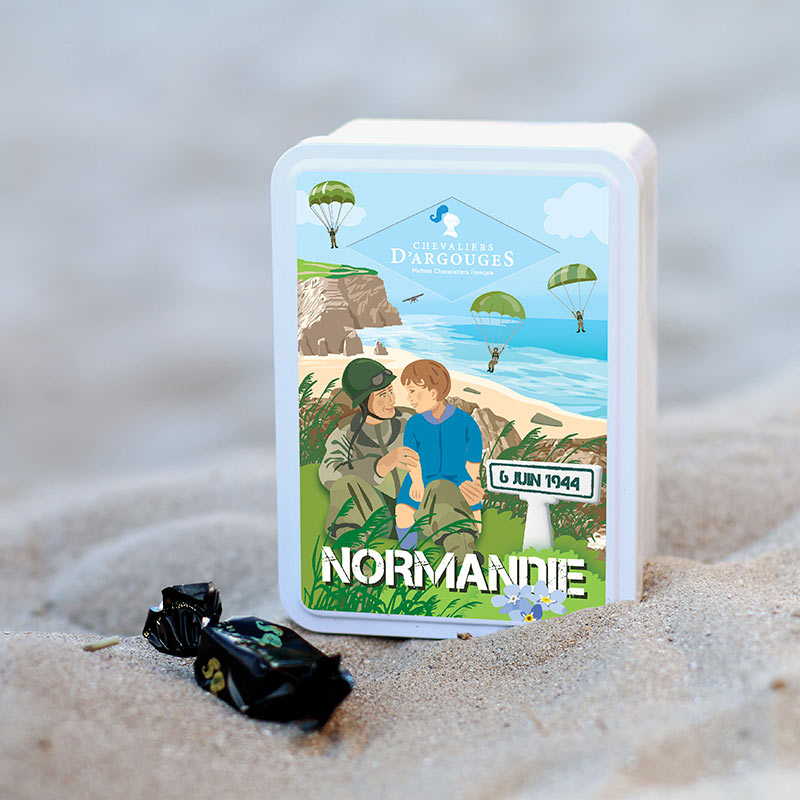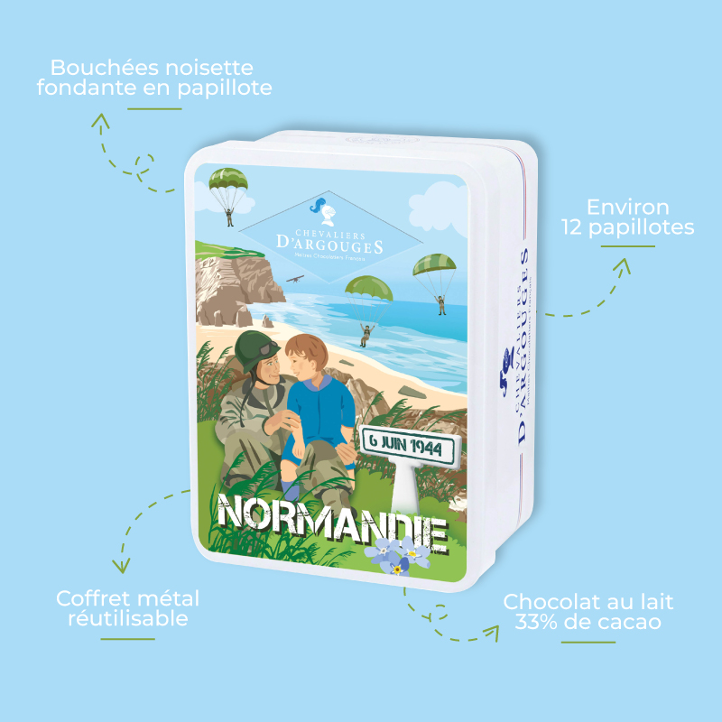 Fondez de plaisir pour nos bouchées noisette fondantes chocolat lait 33% de cacao, le tout présenté dans un élégant coffret métal 6 juin 1944 100g.