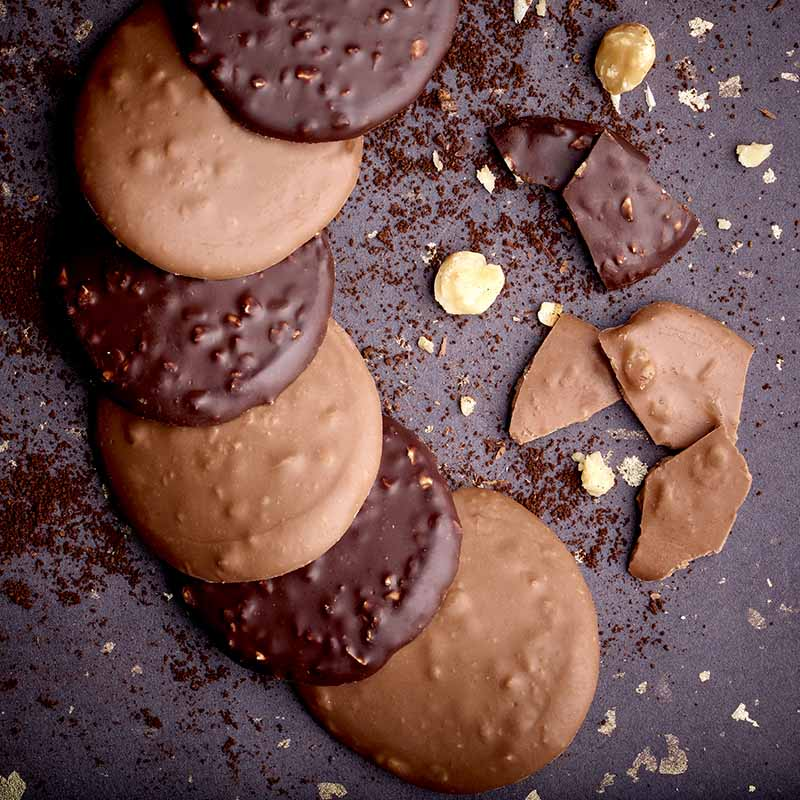 Ce coffret élégant de 140g contient un assortiment raffiné de tuiles au chocolat noir 70% de cacao éclats d'amandes et chocolat au lait 33% de cacao éclats de noisette, pour plaire à tous les palais,