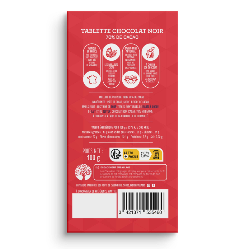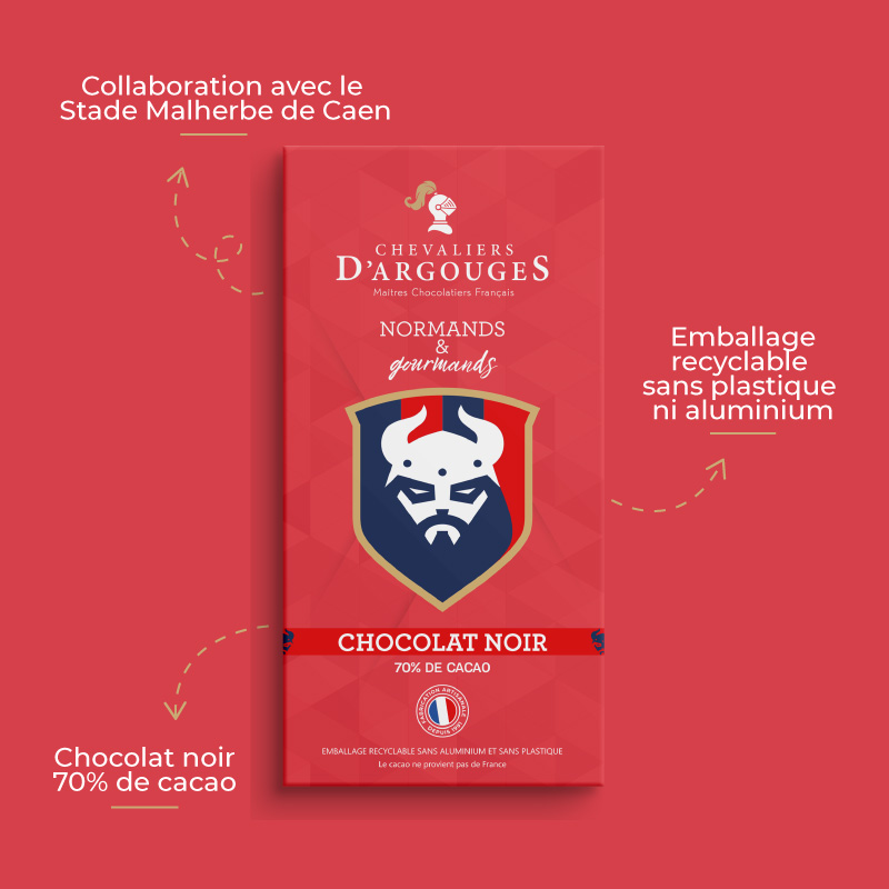 Tablette des Normands chocolat noir 70% de cacao, 100g, créée en collaboration avec le Stade Malherbe de Caen.