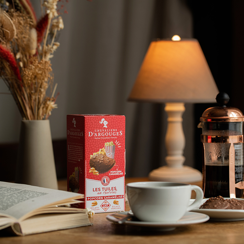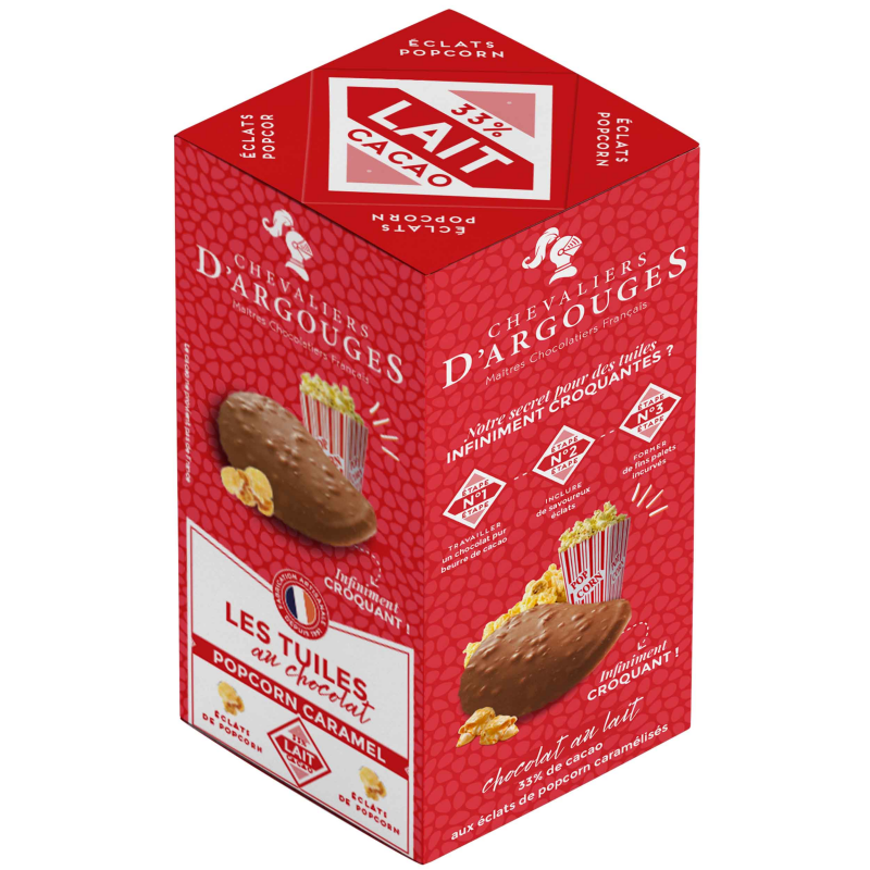 Craquez pour nos tuiles croquantes, une gourmandise fine et savoureuse mêlant chocolat lait 33% de cacao aux éclats de popcorn.