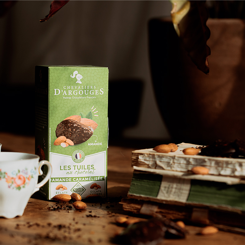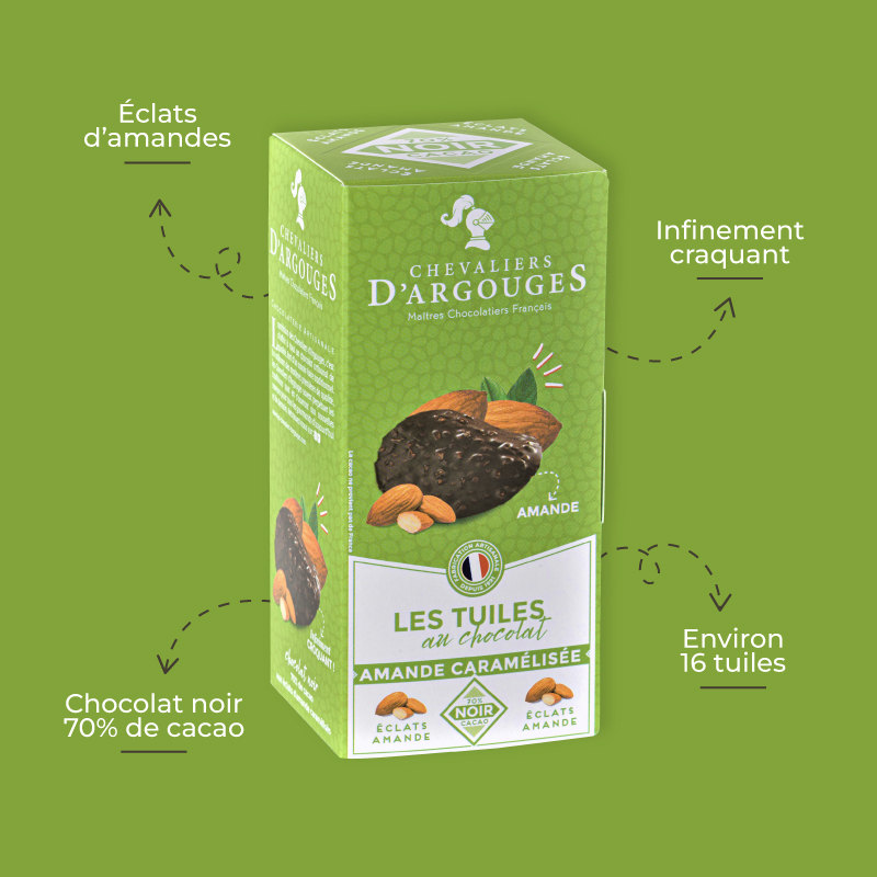 Craquez pour nos tuiles croquantes, une gourmandise fine et savoureuse mêlant chocolat noir 70% de cacao aux éclats d’amandes.